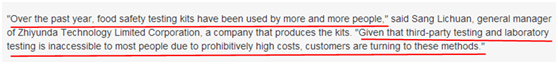 隨著中國食品安全事件的頻繁發(fā)生,越來越多的消費者通過購買食品安全快速檢測產(chǎn)品進(jìn)行自我保護,這些產(chǎn)品可以檢測出食物中是否存在有害毒素、病原體和食品污染物。雖然專家們警告說這些快檢產(chǎn)品不能保證結(jié)果的絕對準(zhǔn)確,但仍有很多消費者爭相購買。