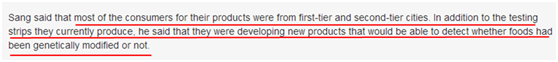 “在過去的一年里,食品安全快速檢測產(chǎn)品已經(jīng)被越來越多的人使用”,桑總介紹說,“大多數(shù)人因為無法支付第三方檢測平臺和專業(yè)實驗室的高額費用,轉(zhuǎn)而使用此類方法。目前使用這些快檢產(chǎn)品的消費者大多來自一線和二線城市,我們一直不斷研發(fā)新產(chǎn)品,目前正在研發(fā)能夠檢測轉(zhuǎn)基因的產(chǎn)品。”