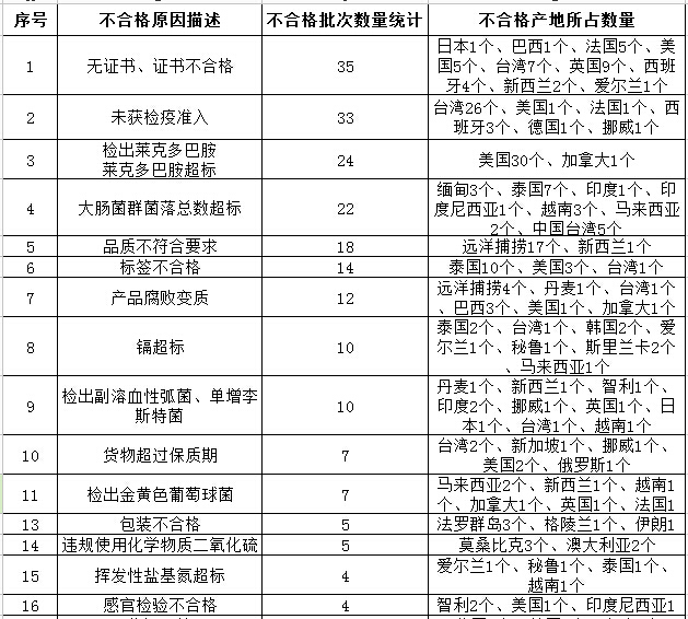證書不合格、未獲檢疫準(zhǔn)入、檢出萊克多巴胺和菌落總數(shù)超標(biāo)為不合格主要原因。以上不合格產(chǎn)品均已依法做退貨、銷毀或改作他用處理,且未在國內(nèi)市場(chǎng)銷售。