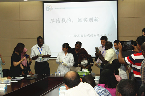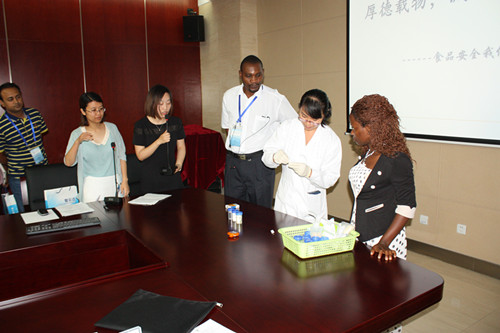 技術(shù)人員邀請訪問團友人一起動手實際操作,親自體驗快檢產(chǎn)品操作便捷、測定時間短、檢測結(jié)果易于分辨的優(yōu)勢。