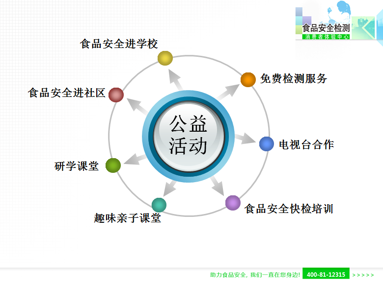 食品安全檢測消費者體驗中心的食安公益活動包括:食品安全快速檢測培訓(xùn)、食安趣味親子互動課堂、研學(xué)課堂、食品安全進社區(qū)、食品安全進學(xué)校等活動