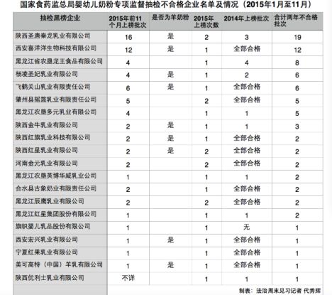 據法治周末記者不完全統計,2015年前11個月,國家食藥總局抽檢結果中不合格嬰幼兒乳粉產品共計69批次,涉及20家乳企;這其中共有46批次不合格嬰幼兒乳粉為羊奶粉,涉及9家乳企。在抽檢中,不合格羊奶粉批次占到抽檢總不合格奶粉批次的66.6%。