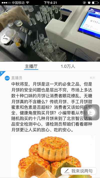 北京智云達(dá)本次與騰訊大燕網(wǎng)聯(lián)合直播,直播間為OMG!現(xiàn)在的月餅?zāi)氵€敢吃嗎?直播過程中在線人數(shù)突破一萬,并在持續(xù)增長中;直播過程中許多熱心網(wǎng)友進(jìn)行提問,北京智云達(dá)技術(shù)人員都一一進(jìn)行詳細(xì)解答。