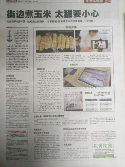 檢測(cè)結(jié)果:八個(gè)玉米樣品均含有糖精鈉,而國(guó)家標(biāo)準(zhǔn)中甜玉米是不得檢出糖精鈉,說明在外面購(gòu)買甜玉米時(shí)很容易就會(huì)購(gòu)買到含有糖精鈉的甜玉米,北京智云達(dá)提醒廣大消費(fèi)者盡量少購(gòu)買路邊攤甜玉米,最好選擇購(gòu)買生玉米在家煮制,以保證食品的安全。