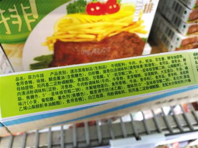 盡管“重組肉”并不違規,但新京報記者近日走訪北京華聯、沃爾瑪等超市發現,不少牛排添加了卡拉膠等食品添加劑,卻以“原切牛排”的名義出售。