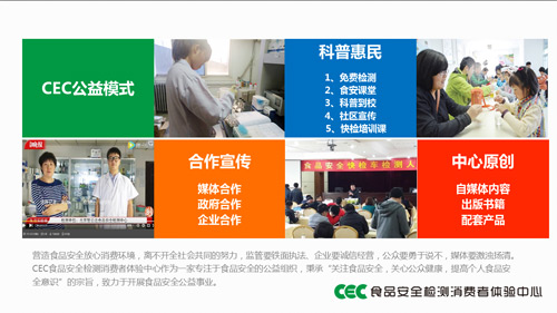 CEC體驗(yàn)中心針對社會(huì)熱點(diǎn)以及常見食品安全問題,與中央電視臺、英國BBC、黑龍江電視臺、北京電視臺、河北衛(wèi)視等多家電視臺合作拍攝近百場科普節(jié)目。與法制晚報(bào)、騰訊大燕網(wǎng)合作進(jìn)行直播,從生活中常見的食品安全熱點(diǎn)問題出發(fā),對網(wǎng)上流傳較廣的信息進(jìn)行實(shí)驗(yàn)驗(yàn)證,將謠傳和誤傳擺上實(shí)驗(yàn)臺,用真實(shí)的實(shí)驗(yàn)數(shù)據(jù)粉碎食品安全謠言。此外還參加低碳大篷車科普活動(dòng)以及遠(yuǎn)赴非洲送去水質(zhì)檢測設(shè)備的公益活動(dòng)。