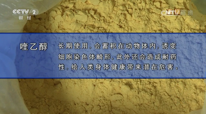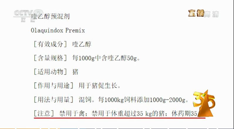 喹乙醇:一種黃色粉末,動物長期食用,會蓄積在動物體內(nèi),誘變細胞染色體畸形。此外還會造成耐藥性,給人類身體健康帶來潛在危害。因此,我國2005年版《獸藥典》以及《飼料藥物添加劑使用規(guī)范》都明確規(guī)定,喹乙醇適用范圍:35公斤以下的豬,禁用于禽、禁用于體重超過35kg的豬、休藥期35天。