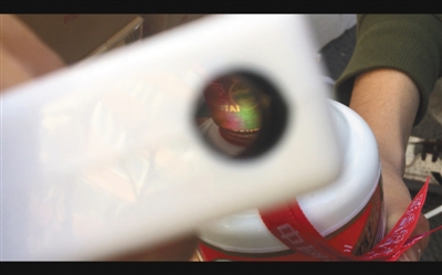 2月25日,記者拆開張建的假茅臺酒檢測真?zhèn)危Y(jié)果顯示瓶蓋處有彩條(根據(jù)說明書提示,此為正品包裝的特征,但記者所檢測的茅臺酒實際為假茅臺酒)。