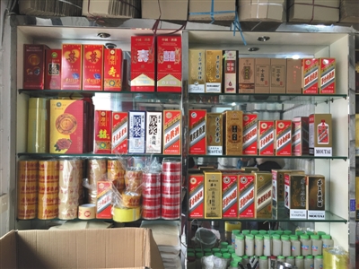 高仿的茅臺酒包裝是興盛路的暢銷貨,包裝上印有條形碼,掃出的價格區(qū)間在500多元到上千元不等。
