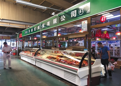 昨日上午,位于大洋路市場熟食區(qū)41號的北京瑞紅商貿(mào)有限公司仍在正常營業(yè)。調(diào)查顯示,4月以來該公司多次從黑作坊購入熟食。新京報記者 李強 攝