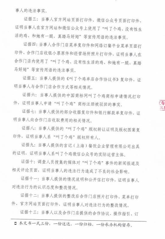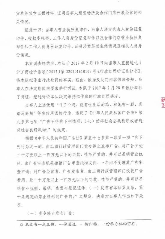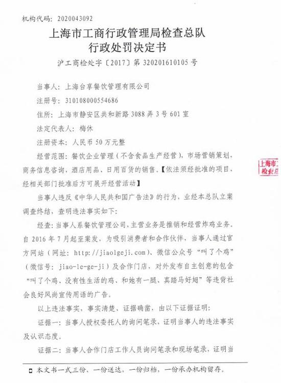 上海市工商行政管理局檢查總隊行政處罰書顯示,當事人系餐飲管理公司,主營業(yè)務是推銷和經(jīng)營炸雞業(yè)務,自2016年7月起至案發(fā),為吸引消費者和合作伙伴,當事人通過官方網(wǎng)站、微信公眾號“叫了個雞”及合作門店,對發(fā)布自主創(chuàng)意的包含“叫了個雞,沒有性生活的雞、和她有一腿、真踏馬好翅”等違背社會良好風尚用于的廣告。