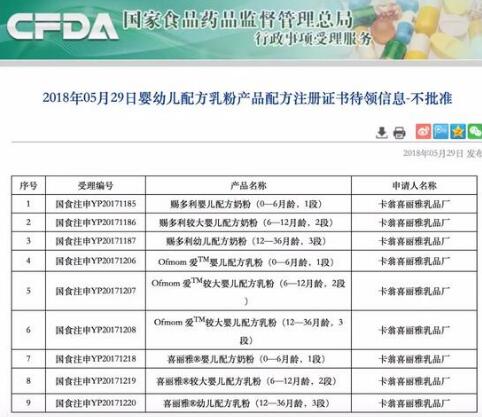 剛剛,原國家食品藥品監(jiān)督管理總局的網(wǎng)站發(fā)布了一份《2018年05月29日嬰幼兒配方乳粉產(chǎn)品配方注冊證書待領(lǐng)信息-不批準(zhǔn)》通告。