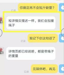 我又問(wèn)對(duì)方的客服,是否可以保證按訂單的貨發(fā)給我,對(duì)方直接告訴我,說(shuō)明上已經(jīng)明確告知,螃蟹是含繩子的分量的,寄回去以后,會(huì)多綁幾根繩子,保證不缺份量再寄給我,無(wú)圖無(wú)真相,我把螃蟹的照片和與對(duì)方的客服的對(duì)話發(fā)上來(lái)。
